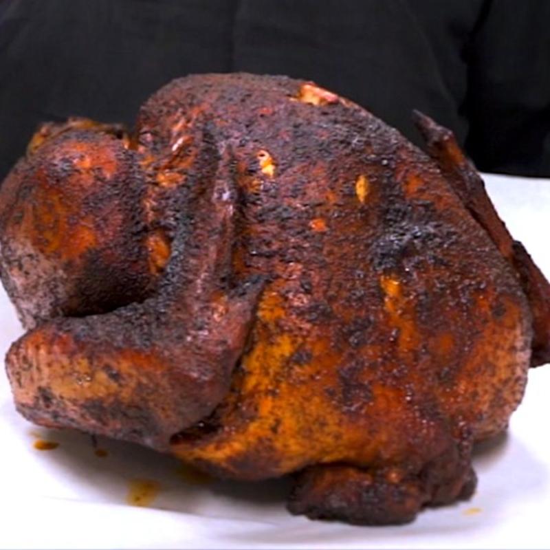 Smoked pulled chicken thigh piled high on a brioche bun.