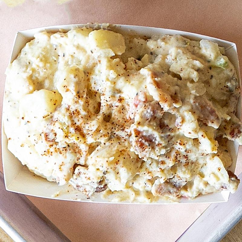 Classic potato salad with bacon bits.