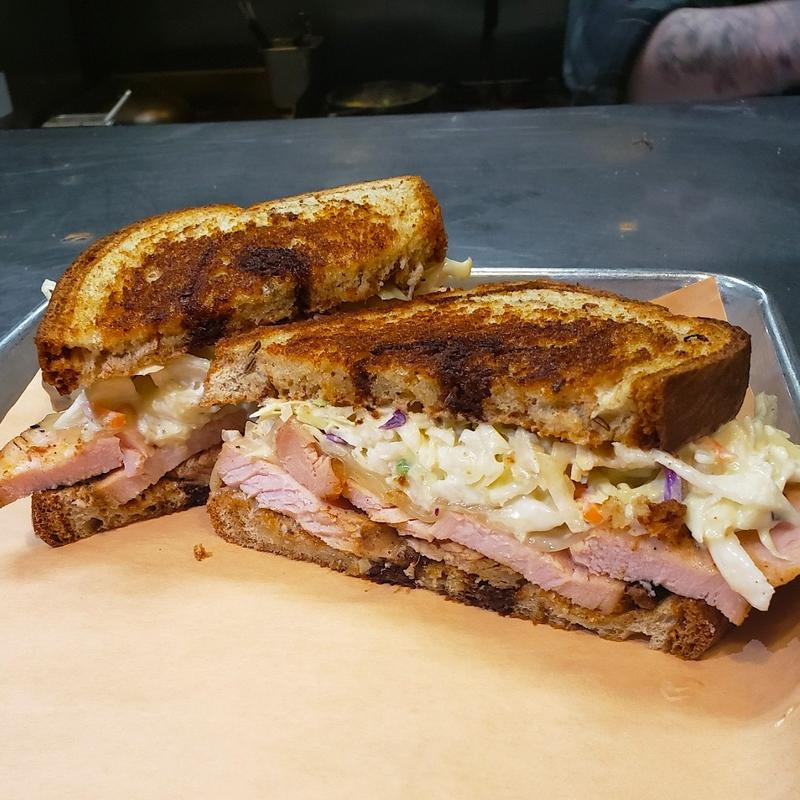 Smoked turkey, Swiss cheese, sweet creamy coleslaw, and house Amarillo Sauce on grilled marble rye bread.