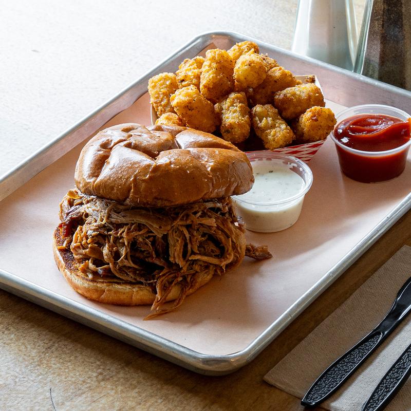 Hotdog from our smoker. Served with Tater Tots, French fries or apple sauce.
