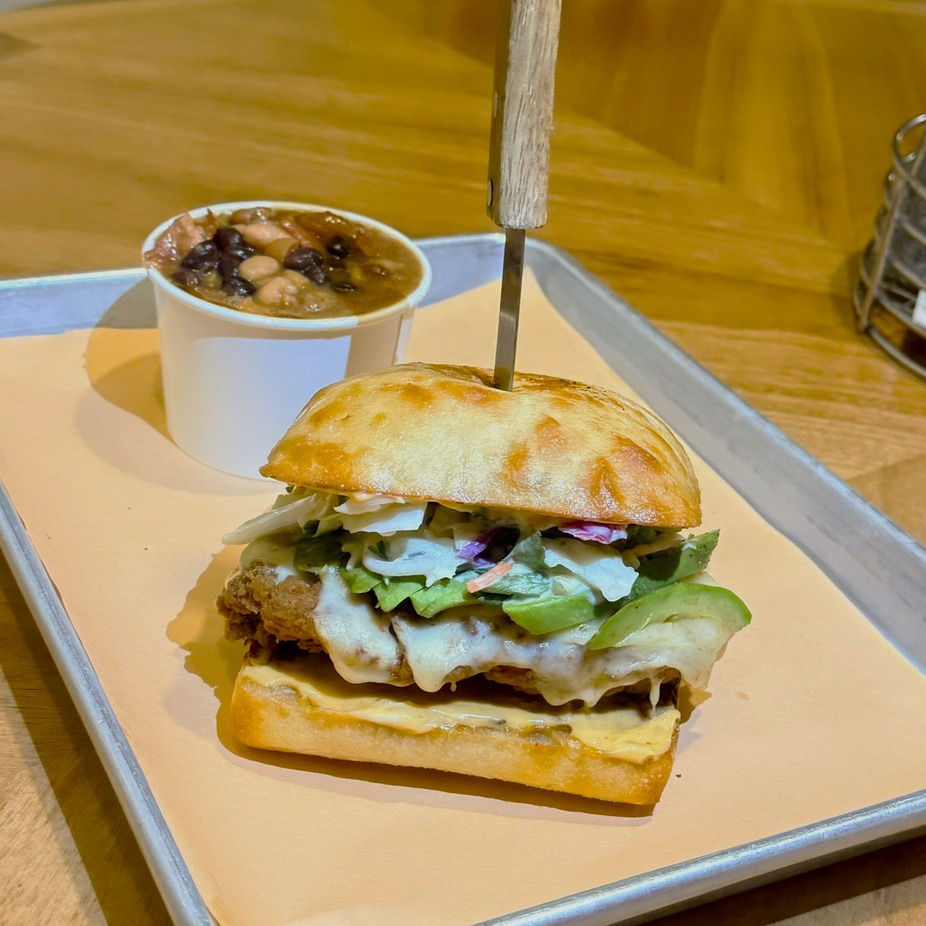 Southwest Crispy Chicken Sandwich - Crispy fried chicken breast, pepper jack cheese, avocado, cilantro lime slaw with a chipotle aioli on a toasted ciabatta bun. Includes a side. $18